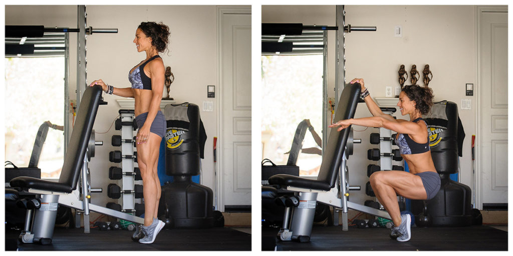 Станьте позади стула. Положите одну руку на спинку стула — вторая рука должна свободно лежать вдоль тела. Став на носочки, выполняйте присед, вытягивая свободную руку вперед для равновесия. Во время этого вида приседания ваши колени будут выходить за линию носков — это нормально.