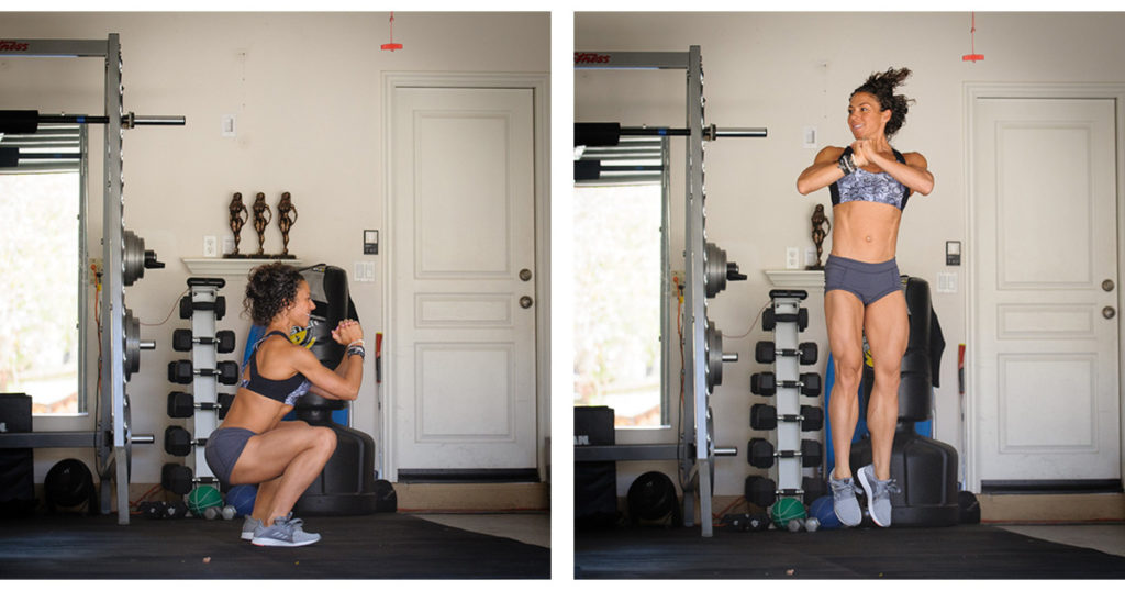 Станьте боком к зеркалу, если занимаетесь перед ним. Опуститесь в глубокий присед, а затем сделайте резкий прыжок вверх, повернитесь на 180 градусов, оказавшись в приседе уже другим боком к зеркалу. Продолжайте выполнять прыжки из приседа, меняя стороны.