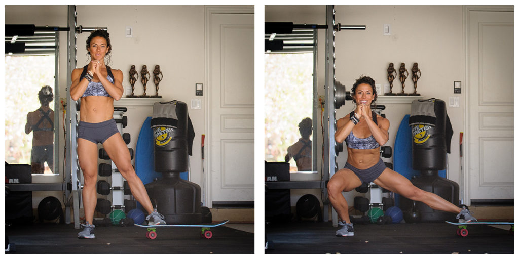 Примите исходное положение для классического приседа. Поставьте одну ногу на скейтборд или кусок ткани, которая позволит вам скользить по полу. Приседая, отводите ногу в сторону. Это очень хорошее упражнение для проработки внутренней поверхности бедра.