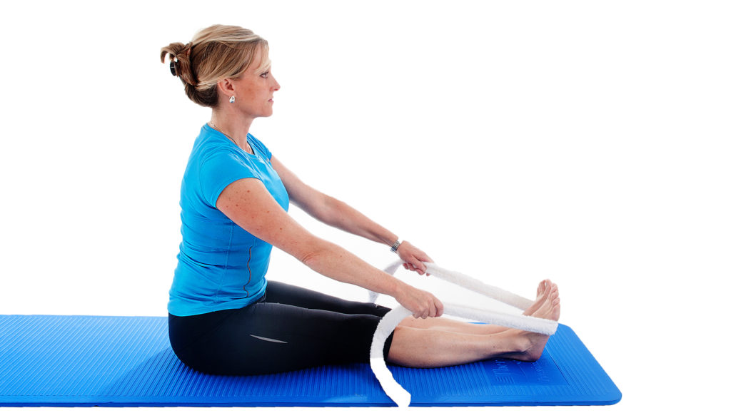 Сядьте на пол и вытяните ноги вперед. Сложите полотенце и поместите его чуть ниже пальцев правой ноги. Теперь ухватитесь за края полотенца и потяните его к себе. Ногу слегка оторвите от пола, но не сгибайте ее в колене. Удерживайте такое положение 15-30 секунд. Повторите 3 раза, а затем смените ногу.