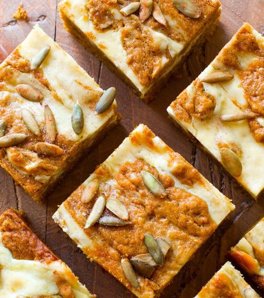 В чаше блендера взбейте сливочный сыр до однородности. Теперь добавьте сахар, яйцо, ваниль и взбивайте на высокой скорости пока масса не станет гладкой. Распределите ложкой сырную массу на тесто (делайте это хаотичными движениями). Теперь добавьте оставшееся тыквенное тесто на сырный слой. Используя нож, смешивайте сырную и тыквенную массу образуя завитки. Посыпьте сверху тыквенными семечками. Выпекайте 35-40 минут. Проверяйте готовность зубочисткой. После выпекания, пирог должен остыть при комнатной температуре, а потом находиться в холодильнике около 2 часов. Разрежьте порционно на кусочки и подавайте.