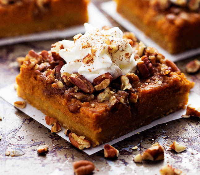 Не будем отрицать: тыквенные пироги – божественны! Но потом мы представляем себе многочасовой процесс вымешивания теста, выпекания, оформления. Есть идея получше! Почему бы не испечь тыквенный десерт, который можно подавать порционно в виде пирожных? Разрежьте получившийся корж на 9 квадратиков – готово! Попробуйте добавить шоколадную стружку, топпинг, орехи, крем… Поверьте, это действительно вкусно!