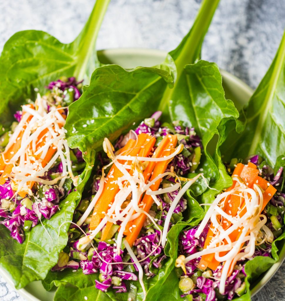 В средней миске смешайте нарезанные овощи, добавьте кунжутное масло и соевый соус. Выложите получившуюся смесь сверху на листья шпината. Сверху добавьте натертую морковь и пророщенные бобы.