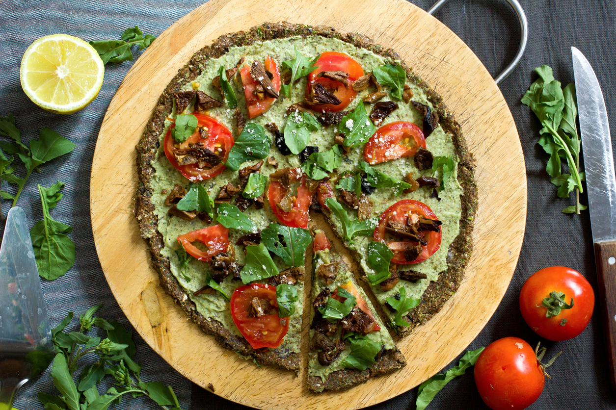 Смажьте соусом заготовку для пиццы, нарежьте овощи и выложите на тесто. Добавьте цедру лимона, зелень, тмин, чеснок и соль. Выпекайте в духовке 20 минут.