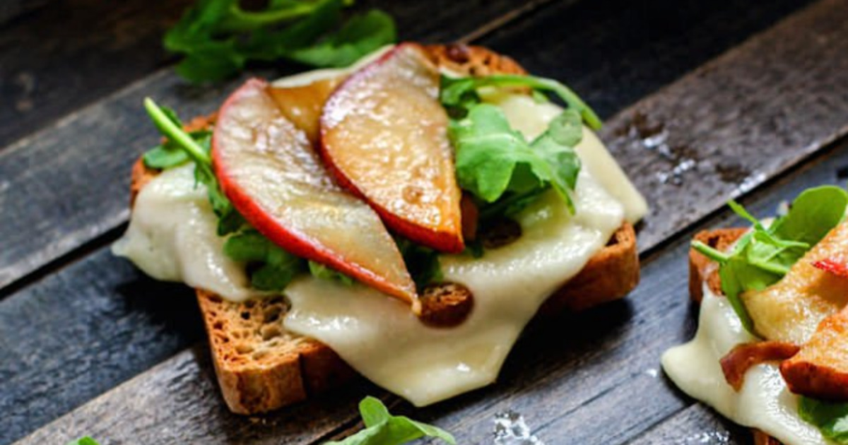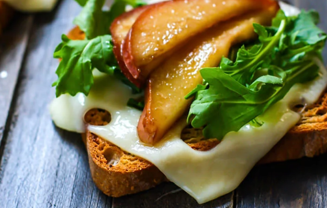 Сделать тосты. На горячий хлеб положить сыр. Нарезать тонкими слайсами грушу, положить на сковороду, добавить уксус, соль, мед и готовить минут 5. Сверху сыра добавить рукколу и несколько ломтиков груши. Полейте глазурью из под груши и посолите.