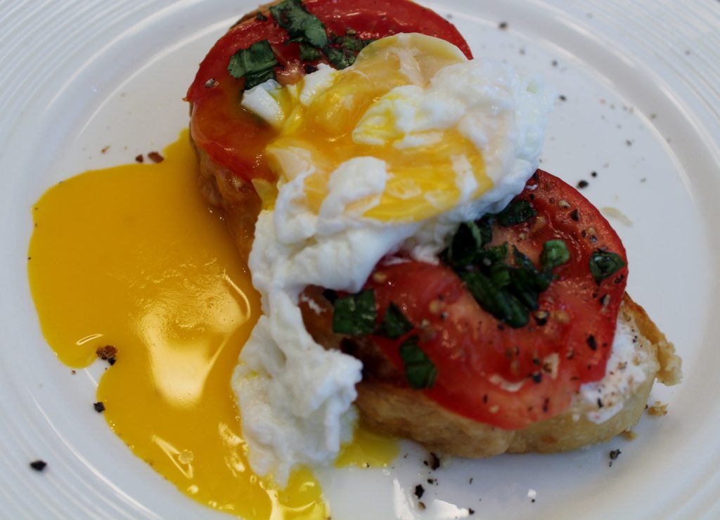 Поджарить хлеб в духовке или тостернице. Намазать козьим сыром. Нарезать мелко томаты, положить их сверху сыра. Посыпать листьями базилика. Сделать яйцо пашот, и каждый желток разбить поверх сендвича. Посолить и поперчить.
