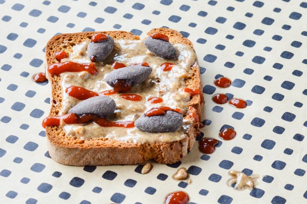 Сделайте тосты в тостернице или духовке. Немного пусть они остынут, намажьте маслом. Положите миндаль в шоколаде. Сбрызните соусом чили.