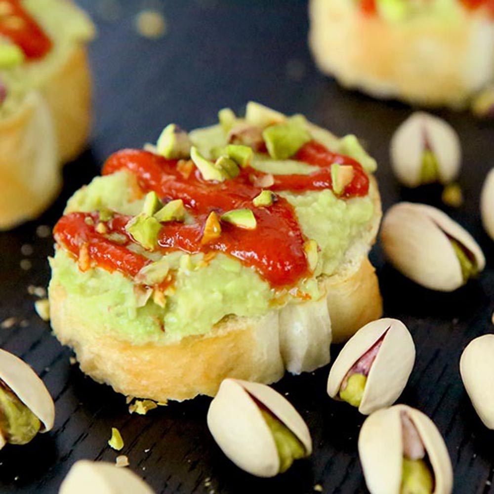 Авокадо размять до однородной массы. Поджарить ломтики багета. Намазать их авокадо. Сверху высыпать дробленые фисташки. Полить чили соусом по вкусу.