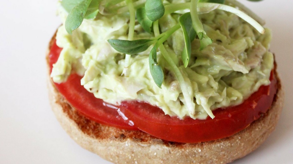 В маленькой миске смешайте авокадо вместе с йогуртом и лимонным соком. Добавьте кусочки курицы и еще раз перемешайте. Цельнозерновой хлебец разрежьте на две части, каждую покройте листом салата и сверху выложите смесь из курицы и авокадо.