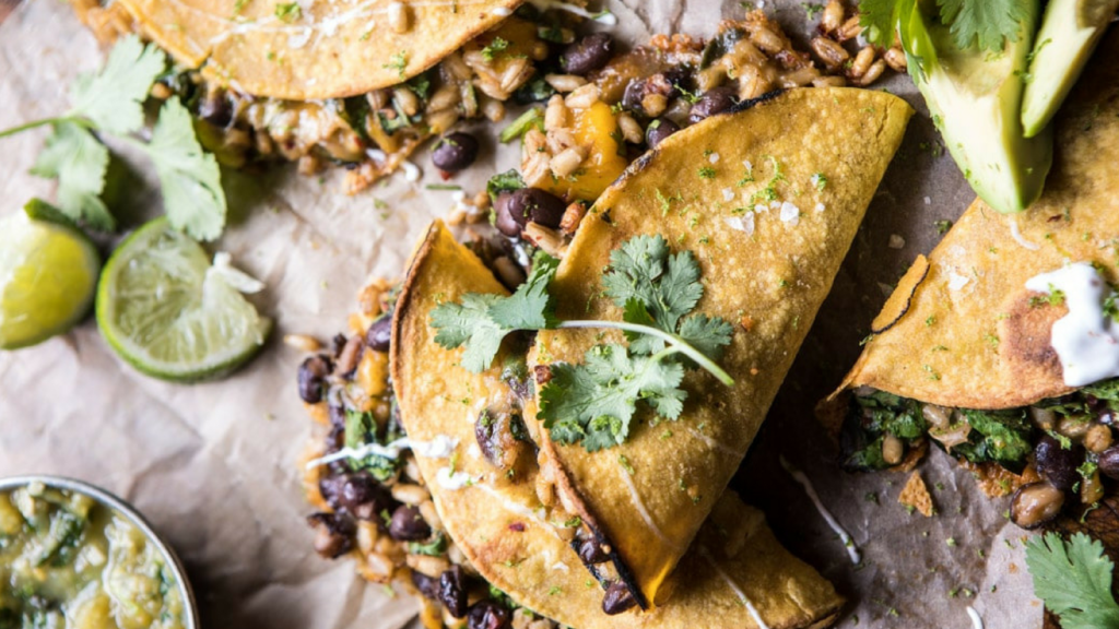 Разогрейте духовку. В миске смешайте рис, черную фасоль, шпинат, манго, перец чили, тмин, кинзу и соль. Намажьте маслом лист для выпечки, положите на него 4 лепешки, а затем равномерно распределите рис, бобы и сыр. Накройте верхними лепешками и готовьте в духовке 5-8 минут, затем переверните и готовьте еще 5 минут. Сделайте сальсу: смешайте зеленый чили, сок лайма, тыквенные семечки и кинзу, посолите. Подавайте лепешки с соусом и йогуртом.