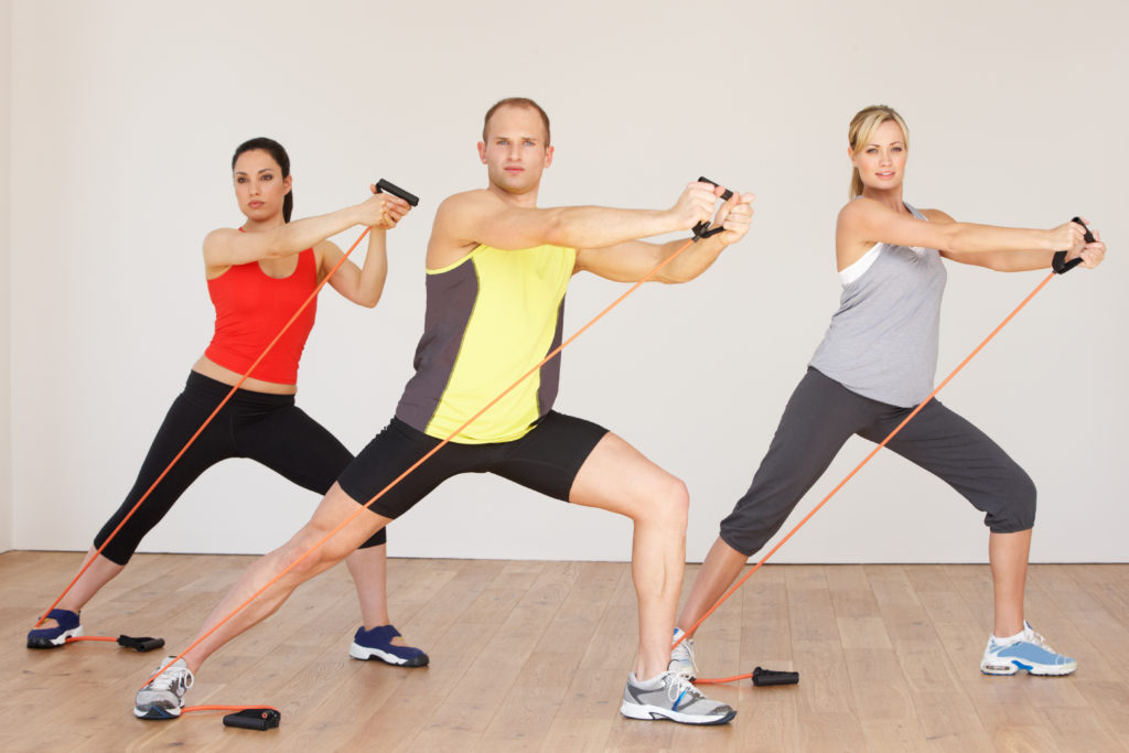 4. Наступите на эластичную ленту одной ногой и тяните ее в сторону противоположной рукой. Через 25 секунд поменяйте руку.