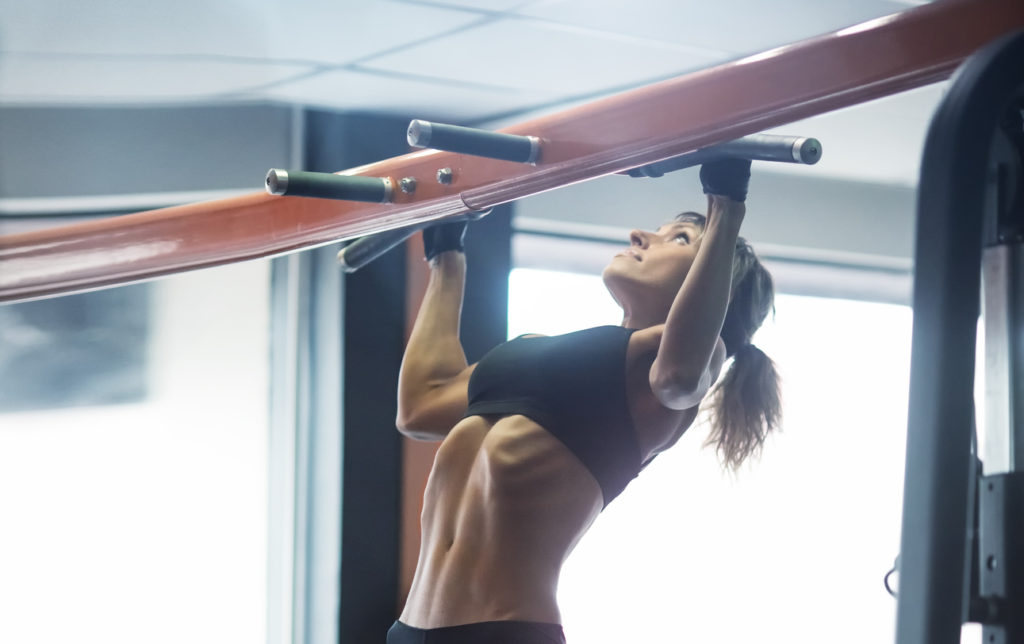 Ухватитесь за низкую перекладину и выполняйте подтягивания, сместив центр тяжести на бедра. В это время ноги должны находиться впереди.