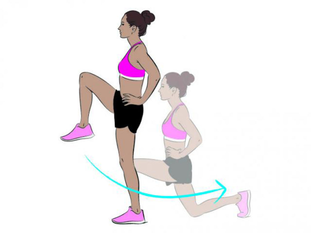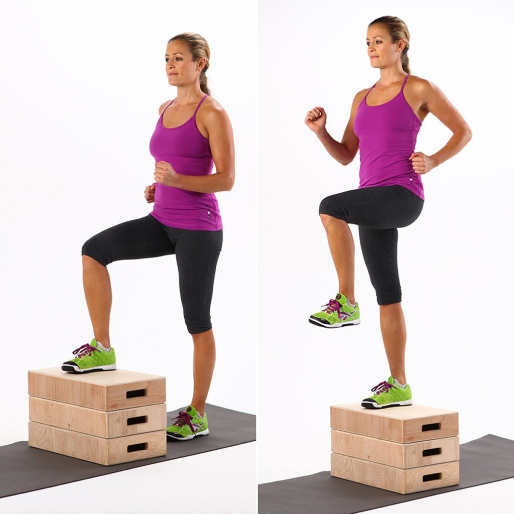 Встаньте лицом к скамье, ноги поставьте на ширину плеч. Поставьте правую ногу на скамью и поднимитесь, сгибая левое колено под углом 90 градусов. Затем опуститесь в выпад и вернитесь в исходное положение. Повторите упражнение с противоположной ногой.