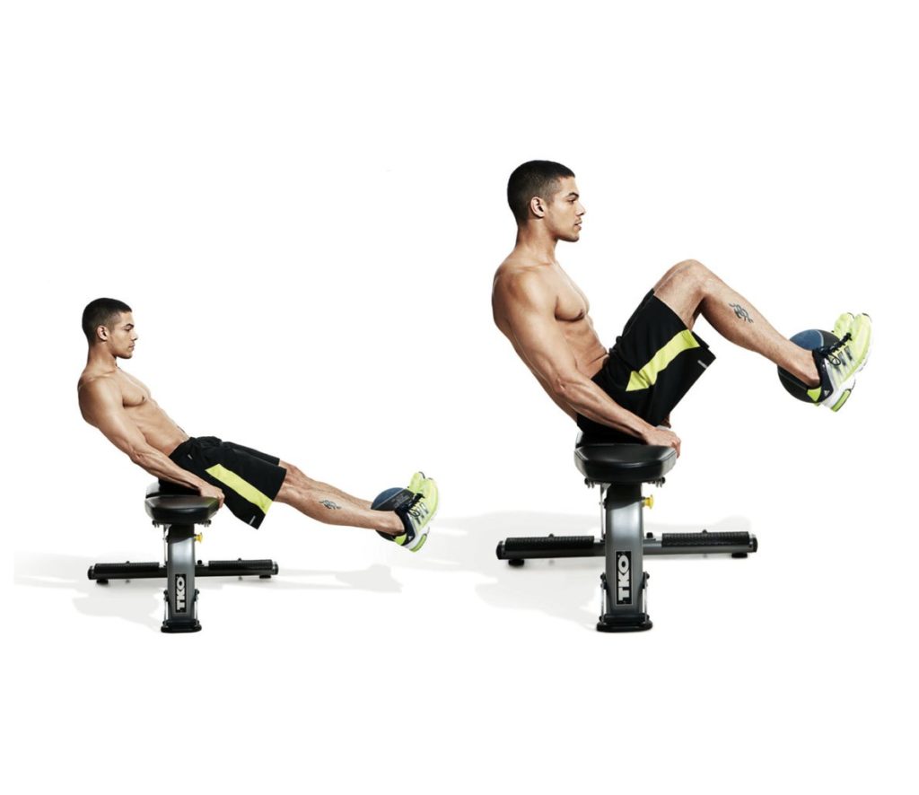 Сядьте на скамью, руки поставьте у бедер, ноги поднимите перед собой, корпус слегка отклоните назад. Начинайте сгибать и разгибать колени, вытягивая ноги вперед и возвращая обратно. Повторяйте упражнение в течении 1 минуты.