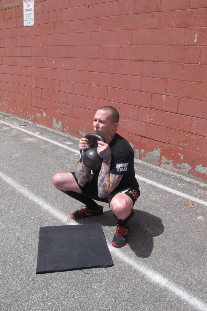 Исходное положение – ноги чуть шире плеч, стойте прямо. Гирю можно взять сразу или при первом приседании. Держите гирю в согнутых руках, перед собой, ближе к груди. Выполните приседания медленно, держа спину ровно. Упёршись пятками в пол, на выдохе вернитесь в исходное положение. Выполните 8-12 повторений.