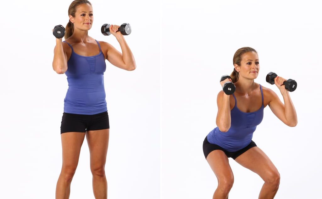 Встаньте прямо, поставив ноги на ширине бедра. Каждая рука держит гантель на плече. Медленно согните ноги в коленях, как будто вы собираетесь сесть на стул. Вес распределите на пятки. Не позволяйте коленям оказаться дальше носков ног. Приседайте так низко, как только можете. Не опускайте грудную клетку и голову. Плечи расслабленны. Медленно выпрямите ноги, чтобы встать. Убедитесь, что позвоночник нейтрален, не округляйте спину.