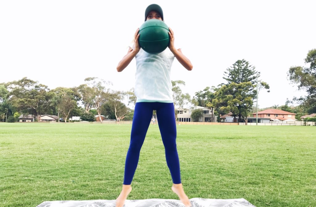 Встаньте ровно, держа медбол перед собой. Затем выполните максимально глубокое приседание, отведя таз назад. Во время подъема бросьте мяч вверх и подготовьтесь поймать его. Это упражнения нужно выполнять в максимально высоком темпе.