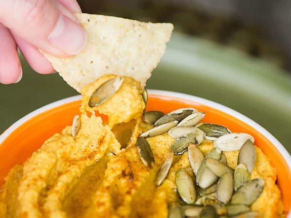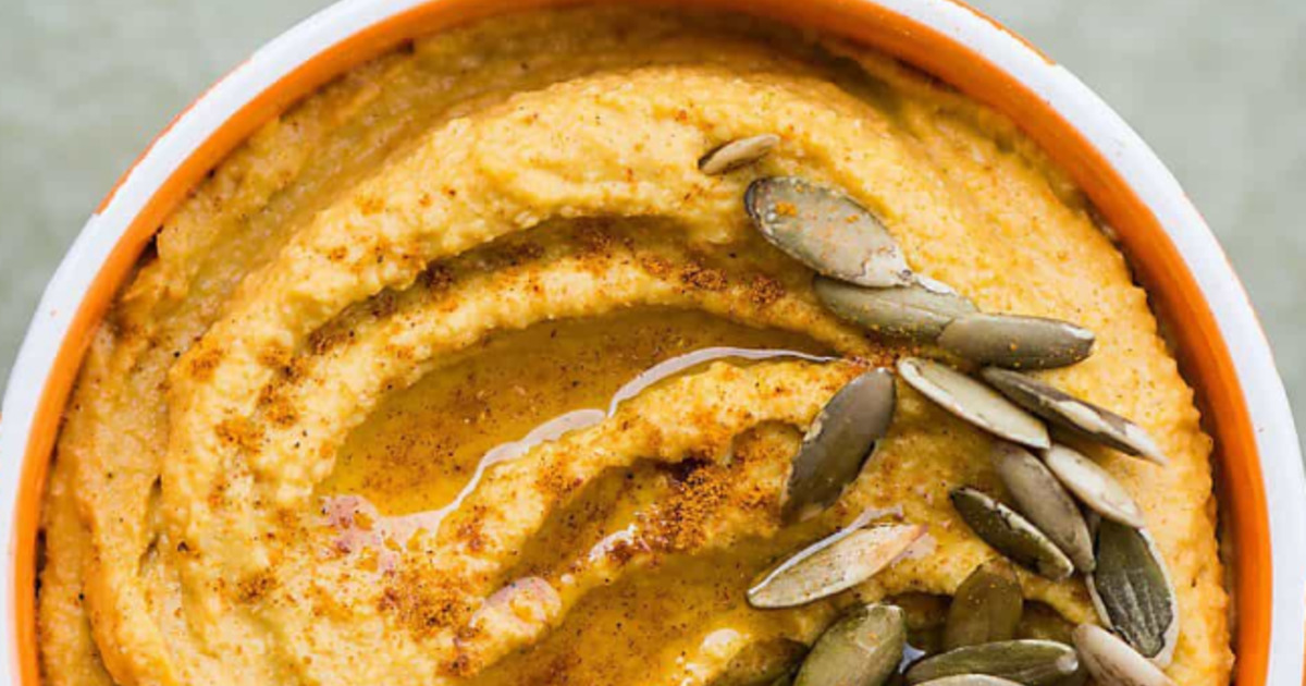 В блендере смешайте тыкву, сваренный нут, тахини и чеснок до однородности. Добавьте лимонный сок, порошок карри и соль. Медленно влейте тонкий поток оливкового масла. Добавьте соль по вкусу.