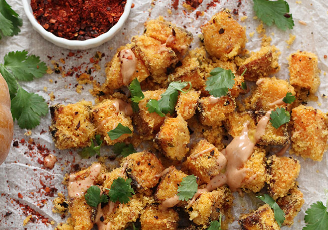 Смешайте кукурузную муку, чили и соль и окуните кубики тыквы в этой смеси.