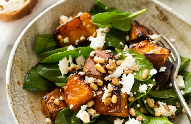 Разогреть духовку до 220C. Смешайте уже очищенную и нарезанную кубиками тыкву с оливковым маслом, солью и перцем. Положите на противень, выпекайте в течение 20 минут. Переверните, затем выпекайте еще 7-10 минут до золотистого цвета. Поджарьте слегка кедровые орехи. Сделайте заправку. Смешайте шпинат, орехи, тыкву и посыпьте фетой. Сверху полейте соусом.