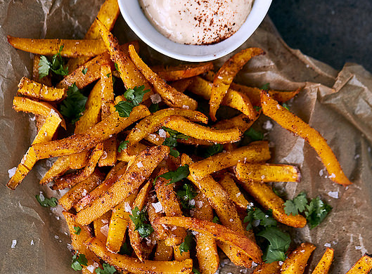 Очистить тыкву, нарезать ломтиками, как для картошки фри. Замочите в воде минимум на 30 минут. Затем высушите тыкву. Разложите на пергамент. Разогреть духовку до 200 градусов. Посыпьте тыкву крахмалом, оливковым маслом, всеми остальными приправами и солью. Запекать минут 15-20. Перевернуть по истечение половины времени. Подавать с любым соусом.