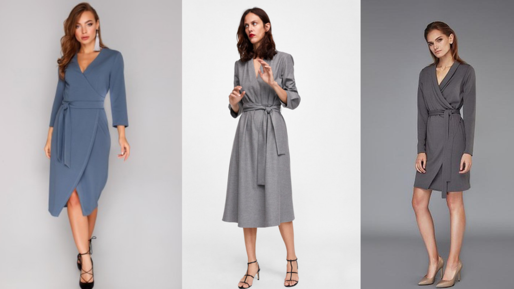 Классика всегда найдет себе применение, даже если это обычное платье на запах серого цвета. Оно будет уместным на собеседовании или в офисе, к тому же серый прекрасно сочетается с другими оттенками и подходит всем.