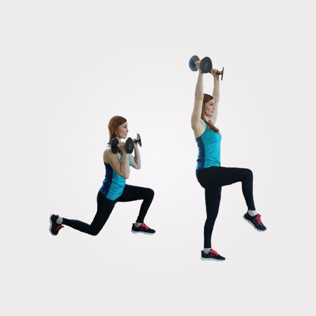Станьте прямо, ноги и руки с гантелями в свободном положении опущены вниз. Сделайте выпад вперед на одну ногу, перенося на нее вес тела, колено другой ноги опустите на пол. Одновременно с этим руки сгибайте в локтях, гантели касаются плеч. Не останавливаясь, выполните 2-ю часть упражнения: встаньте на опорную ногу, выпрямив ее, а другую ногу, так же согнутую в колене, поднимите перед собой, делая нечто похожее на мах. Поднимите гантели вверх, выпрямите руки. Затем примите исходное положение. Повторите до 10 раз. Очень важно делать все без перерывов.