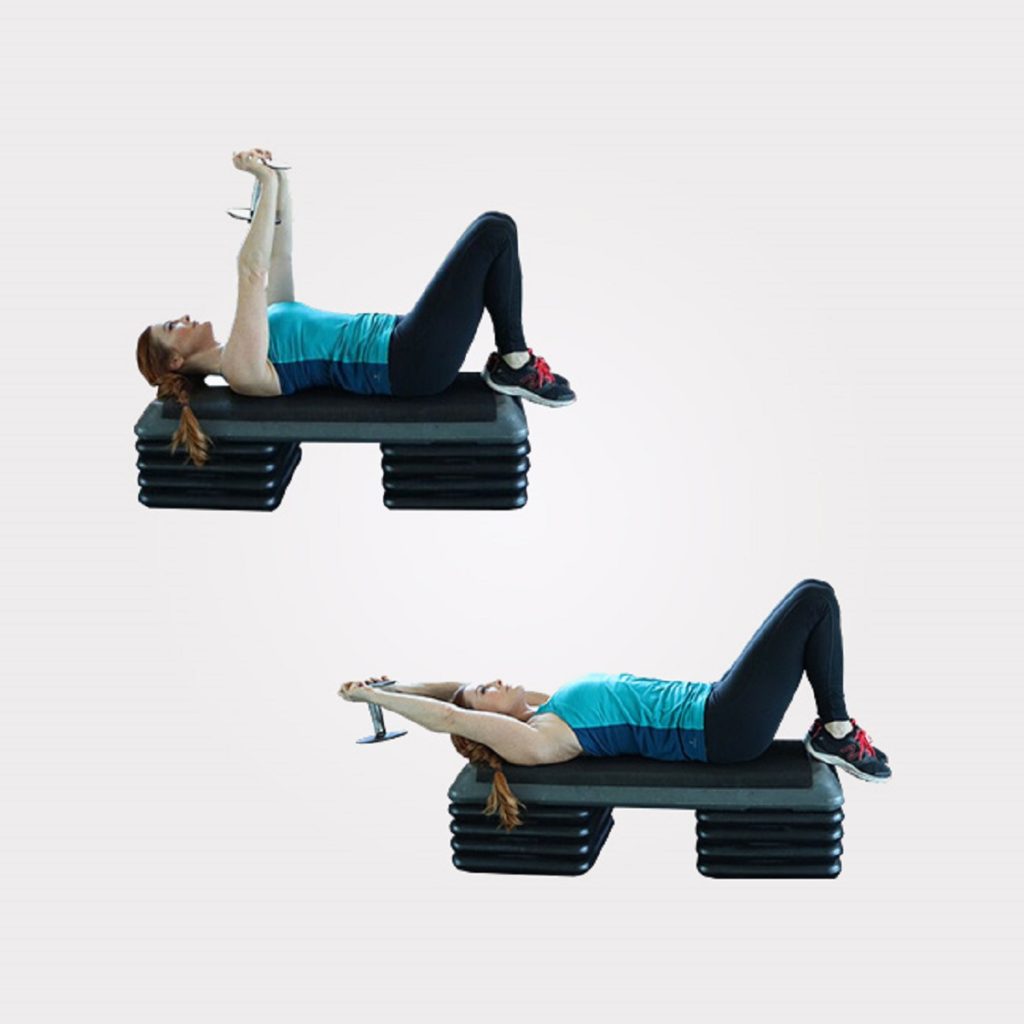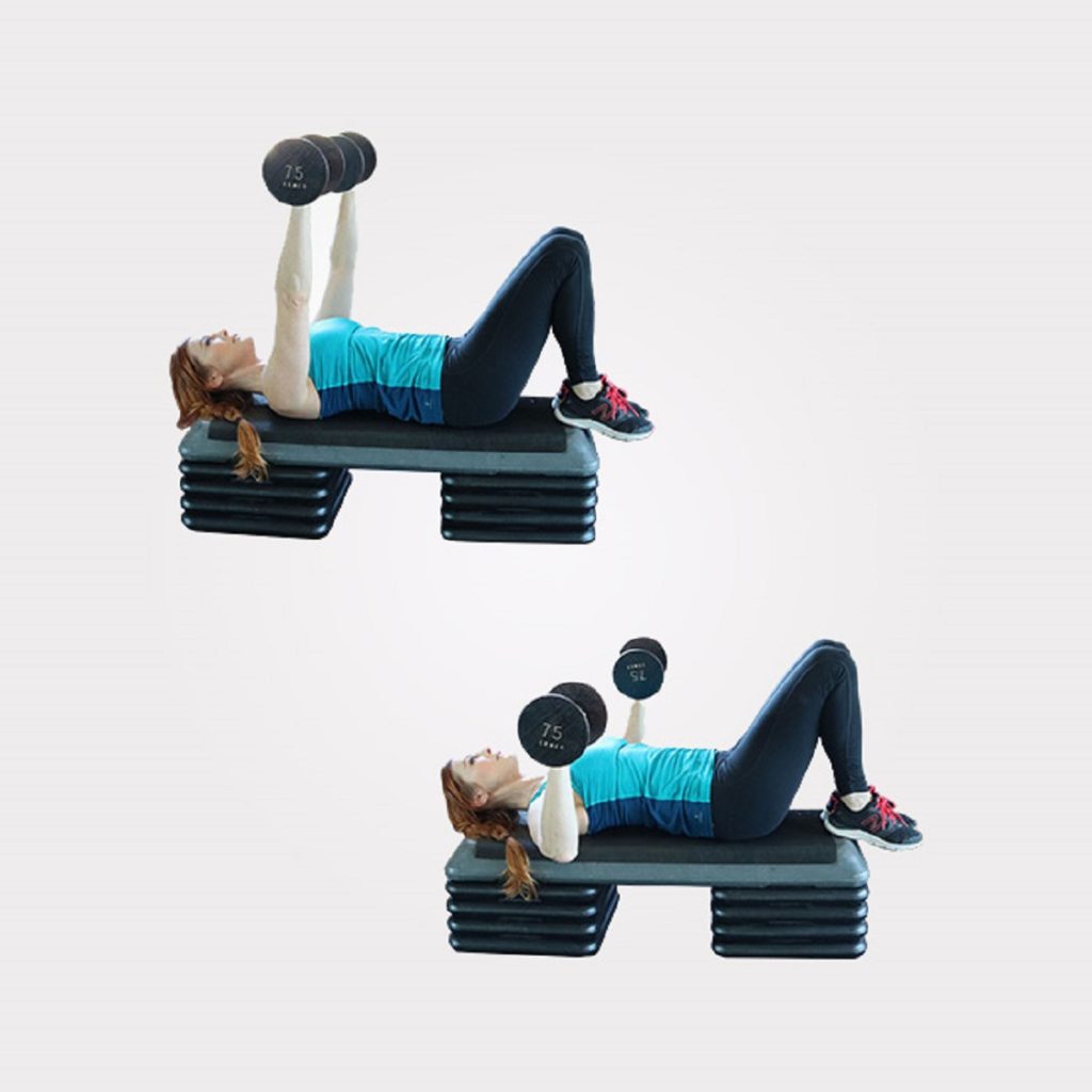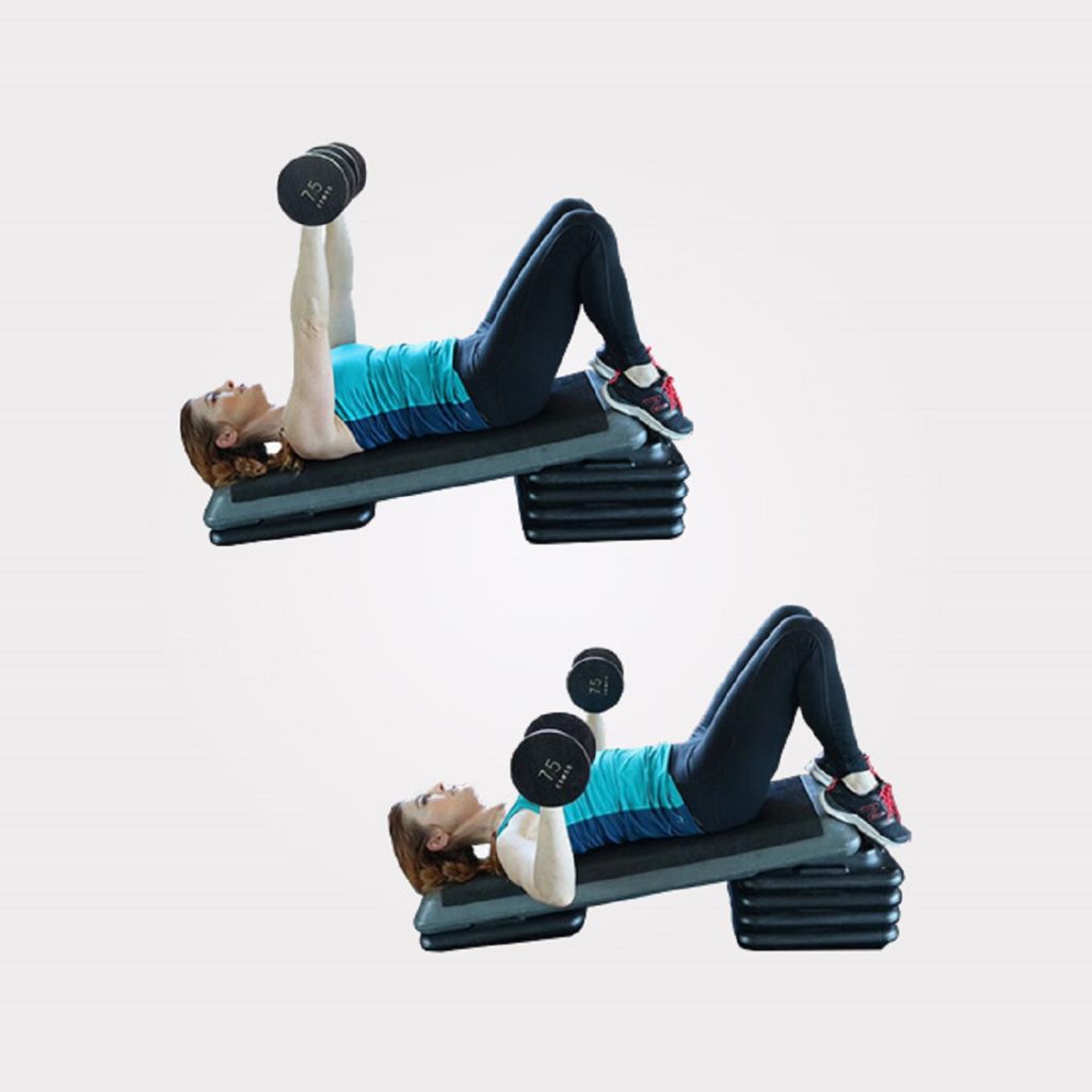 Это упражнение выполняется лежа на плоскости. Ложитесь на спину, ноги согните в коленях, руки с гантелями согните в локтях и немного отведите в стороны так, чтобы они образовали букву «П». Выпрямите руки, подняв гантели над собой, а затем верните их в исходное положение. Не останавливайтесь, повторите упражнение 15 раз.