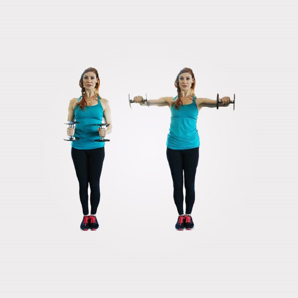 Техника упражнения очень проста. Обязательно следите за спиной и плечами. Зафиксируй их в подтянутом положении. Руки согнуты в локтях и прижаты к корпусу. Гантели держите в вертикальном положении. Поднимите согнутые локти так, чтобы ваши руки образовали букву «П», а гантели приняли горизонтальное положение. Теперь ваши руки с гантелями должны быть параллельны полу. Зафиксируйте буквально на пару секунд эту позицию и опустите руки в прежнее положение. Повторите 15 раз без перерывов.