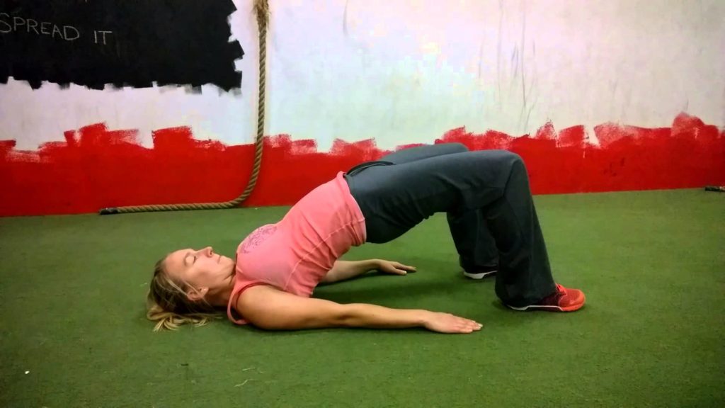 Лягте на спину, согнув колени. Стопы должны стоят на полу, а руки лежать ладонями вниз. Поднимите бедра, пока ваше тело не образует прямую линию от плеч до колен. Затем вернитесь в исходное положение. Повторите 10-12 раз.