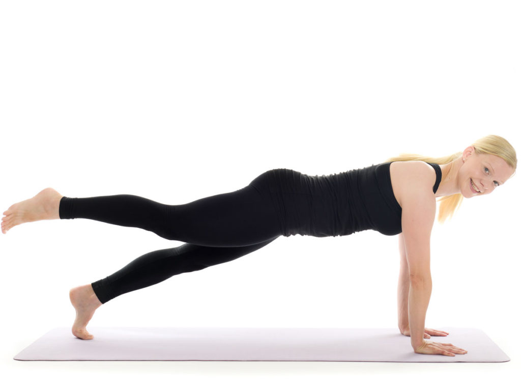 Примите положение как для отжимания. Ваши локти должны находиться прямо под вашими плечами. При этом тело должно образовать прямую линию — от лодыжек до шеи. В такой позе поднимите одну ногу вверх. Затем вернитесь в исходное положение и поднимите другую ногу. Сделайте еще 10 подходов на каждую ногу.