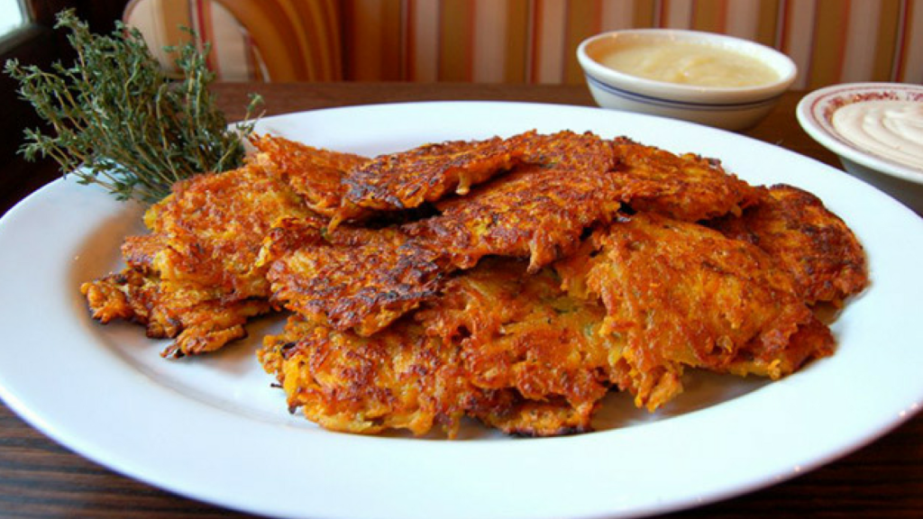 Натрите на терке очищенный картофель и луковицу. Добавьте к ним муку, соль и перец и перемешайте. Смешайте брынзу с яйцом и добавьте к смеси с картофелем. Перемешайте, сформируйте деруны и обжарьте их на растительном масле. Можно также приготовить обычные деруны, но с начинкой из брынзы – для этого просто нужно не смешивать начинку со смесью из картофеля, а выкладывать на сковороду сначала порцию картофельной смеси, потом начинку из брынзы, и опять картофель. Подавайте деруны с чесночным соусом, сметаной или турецким йогуртом.