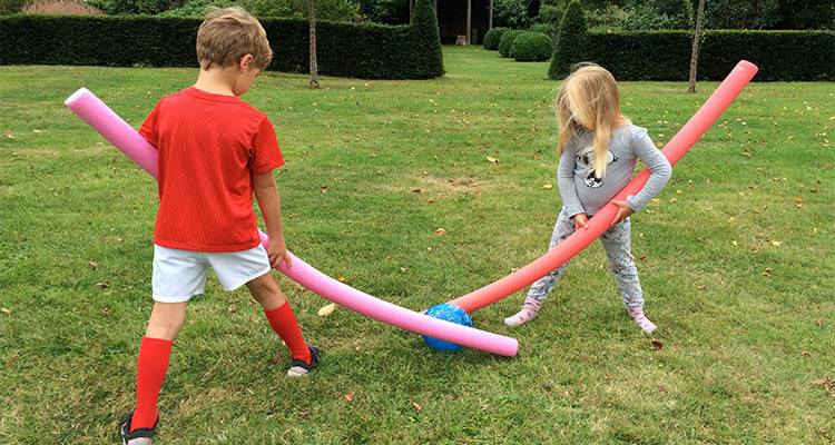 Мягкие трубки, которые называются нудлы или аквапалки, которые используют на занятиях по плаванью, можно придумать большое количество различных веселых игр с мячом на улице. Гнущиеся трубки можно поставить как ворота, можно симпровизировать препятствия или игру в крокет: сделать туннели для мячей. А также, использовать их как клюшки для отбивания.