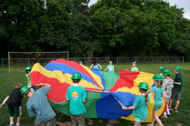 С большим плотным куском разноцветной ткани можно придумать много интересных игр. Дети могут взяться по краям ткани. И, например, подбрасывать и ловить мяч, стараясь подбросить его как можно выше. Также тканью можно «ловить» игроков, накрывая их «в домик». Вместо этой ткани можно использовать обычную простынь. Детям будет не менее интересно.