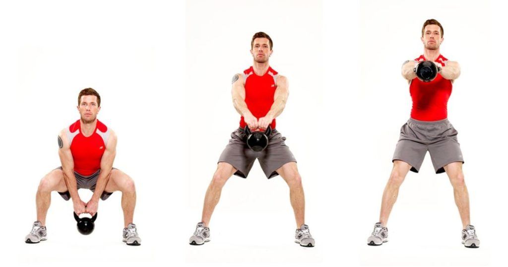 Во время данного упражнения также будет работать как нижняя часть тела (во время приседания), так и верхняя (во время раскачивания и подъема гири). К тому же такая тренировка не оставит без внимания и пресс, поскольку на него ляжет весь груз по удержанию равновесия.