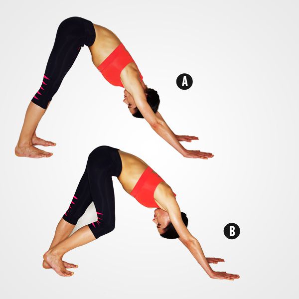 Займите положения для отжиманий и сделайте несколько шагов вперед так, чтобы ваши руки и ноги полностью выпрямились, а бедра поднялись в максимально высокую точку. Теперь поочередно отрывайте пятки от пола, сгибая колено. Сделайте по 10 повторений для каждой ноги.