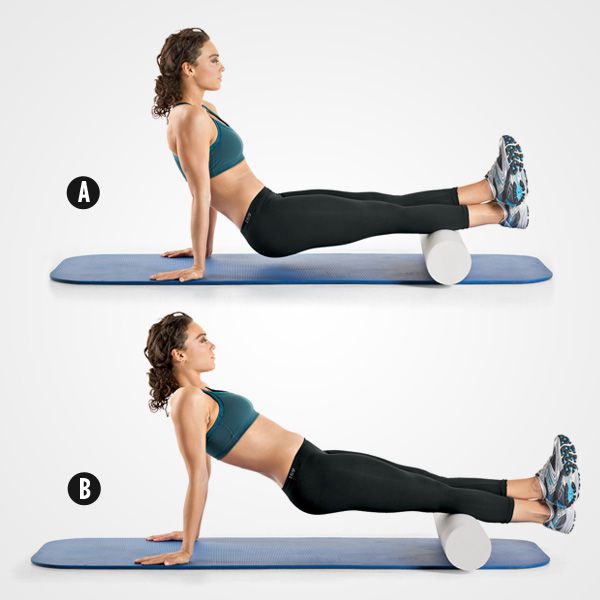 Ложитесь на пол и поместите левую ногу на гимнастический валик. Обопритесь руками о пол и положите правую ногу на левую, скрестив их. Теперь оторвите бедра от пола и двигайтесь вперед, отталкиваясь руками. Продолжайте на протяжении 3 минут, а затем смените ногу.