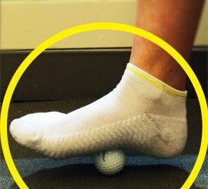 Положите ступню на небольшой жесткий мячик (теннисный, для гольфа или любой другой). Катайте его на протяжении минуты, перенеся на ногу значительную часть своего веса. Повторите упражнение для другой стопы.