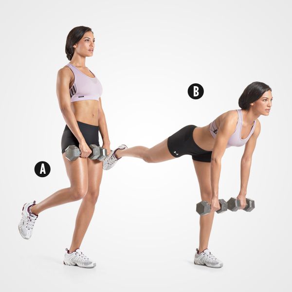 Удерживайте гантели возле бедер, балансируя на одной ноге. Наклоните корпус вперед, а ногу вытяните назад. В этот момент все ваше тело должно быть почти параллельным полу. Вернитесь в исходное положение и повторите. Сделайте по 3 подхода из 10 повторений для каждой ноги.