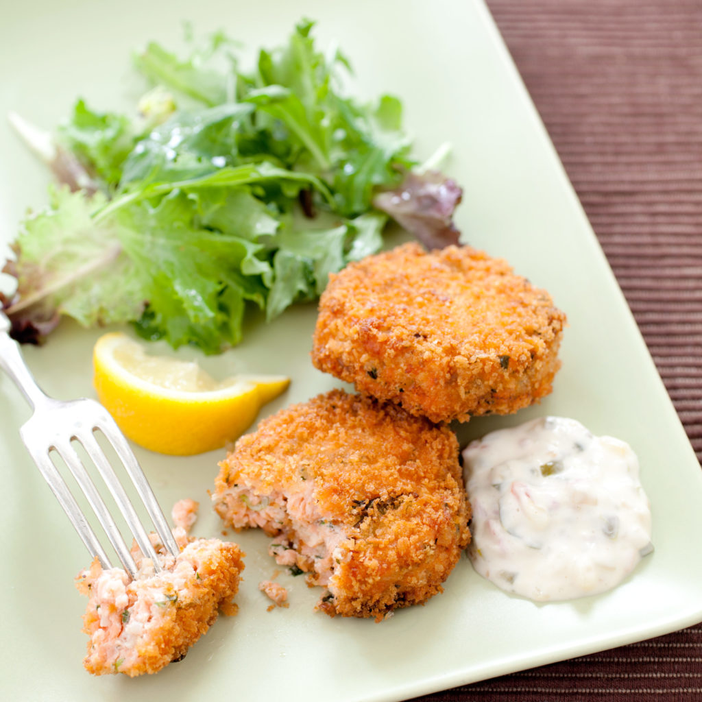 В кухонном комбайне взбейте лосось, лук, горчицу, ½ чайной ложки соли и ¼ чайной ложки перца. Сформируйте котлеты и посыпьте их хлебными крошками. Обжарьте на оливковом масле до готовности. Подавайте со сметаной и луком.