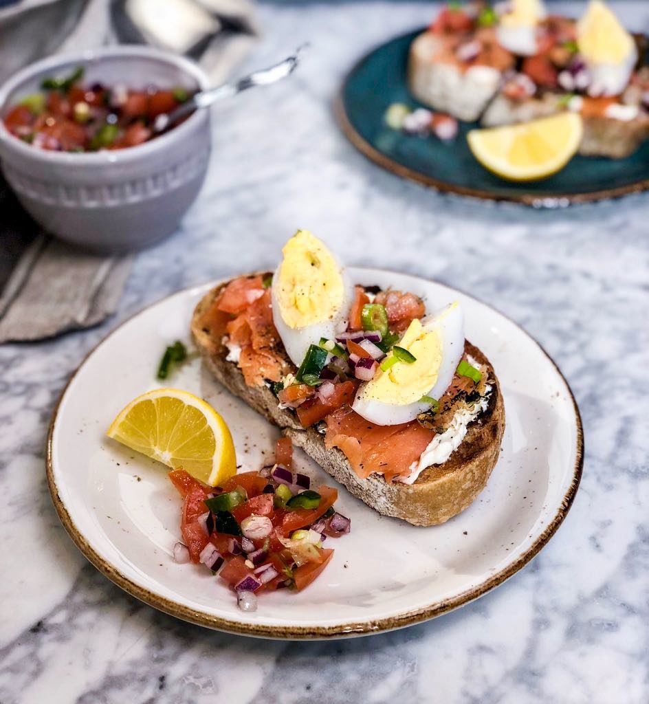 Намажьте хлеб сливочным сыром и равномерно распределите нарезанное яйцо, лосось, каперсы и укроп. Посыпьте солью и перцем, затем подавайте к столу.