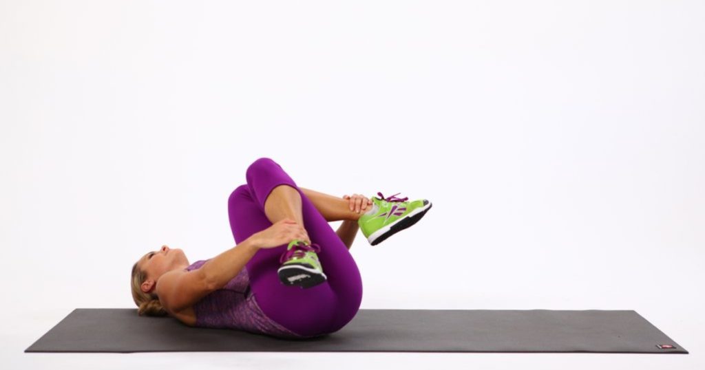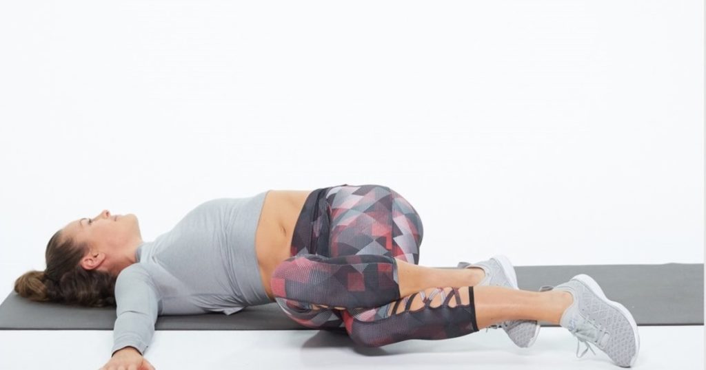 Лягте на коврик. Забросьте правое колено поверх левого. Обхватите руками обе лодыжки и тяните их на себя. Следите за тем, чтобы мышцы шеи и спины оставались спокойными. Задержитесь в растяжке 30-60 секунд, а затем поменяйте колени местами.