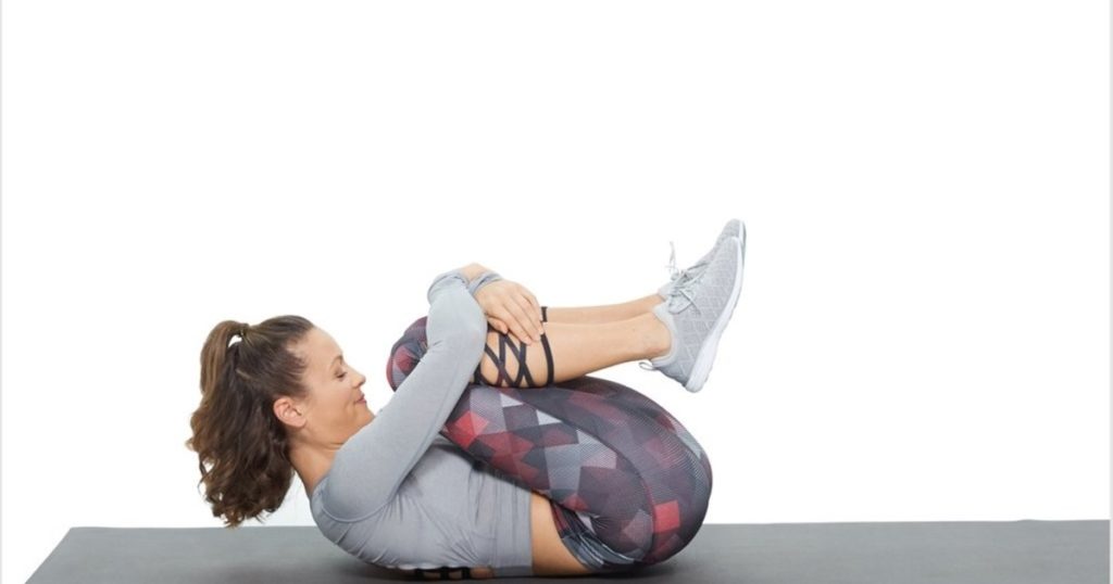 Лягте на коврик и подтяните к груди согнутые в коленях ноги, почувствовав натяжение мышц поясницы. Чтобы усилить растяжку, потянитесь к коленям лбом. Задержитесь в такой позе 20-30 секунд.