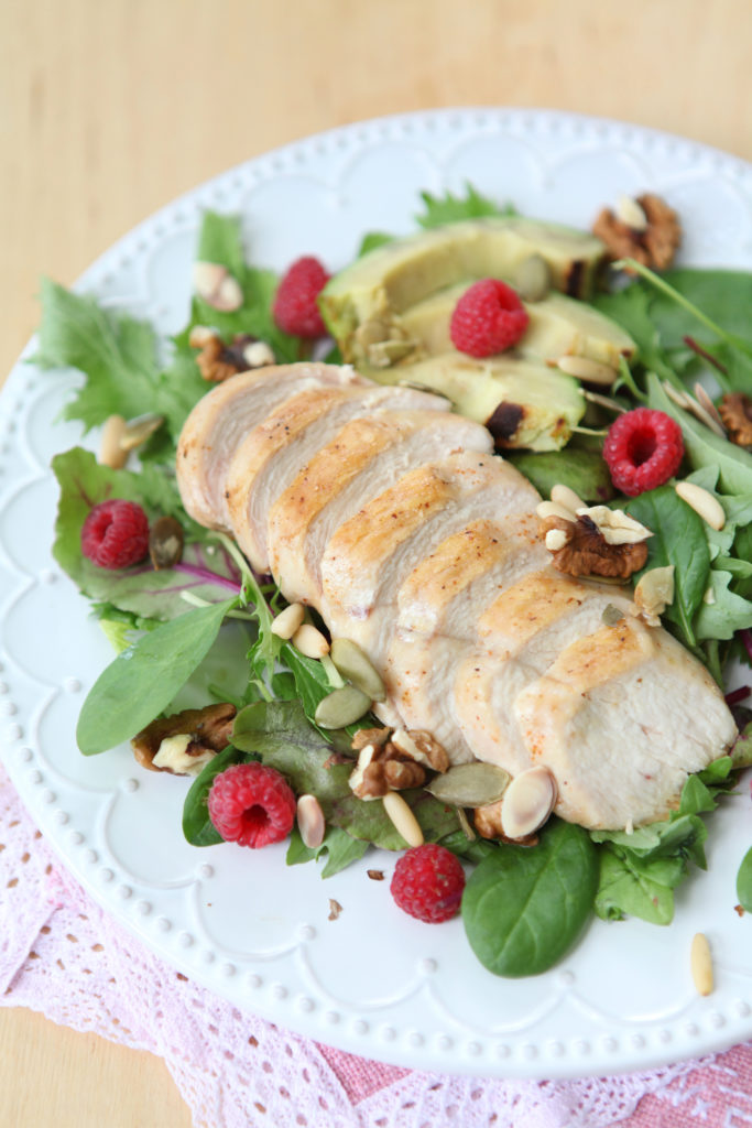 Ополосните филе под струей воды и вытрите бумажным полотенцем, затем, посолите, поперчите, натрите чесноком и оливковым маслом. Отправьте в духовку (180 градусов) и запекайте до появления золотистой корочки. Когда немного остынет – нарежьте на продолговатые кусочки. Очищенный авокадо (можно использовать свежий или запеченный) нарежьте и сбрызните лимонным соком. Рукколу замочите в прохладной воде на 20-30 минут, затем обсушите и измельчите ножом или руками. В салатник выложите рукколу, затем филе, авокадо и сверху выложите вымытые ягоды малины. Влейте заправку и, по желанию, посыпьте миндальными хлопьями.