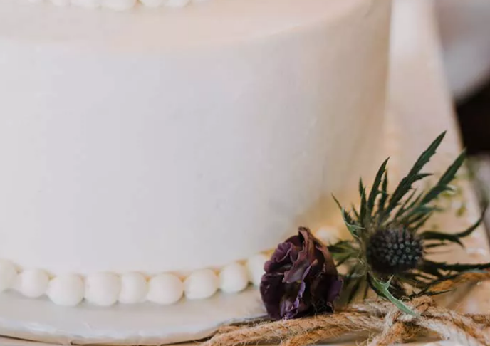 Если вы задумали высокий торт, но не знаете, какую добавить изюминку или главную деталь, то есть вот такая идея. Попросите кондитера обернуть торт в ленту, пусть она будет контрастная — фиолетовая или цвета марсала.