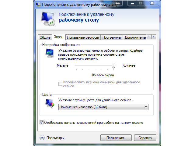 Нажмите кнопку «Параметры», расположенную в нижнем левом углу диалогового окна. Откроется новое окно со списком вкладок вверху. Перейдите на вкладку «Экран», чтобы изменить размер удаленного рабочего стола. Двигайте курсор по линии, чтобы увеличить или уменьшить размер удаленного рабочего стола.