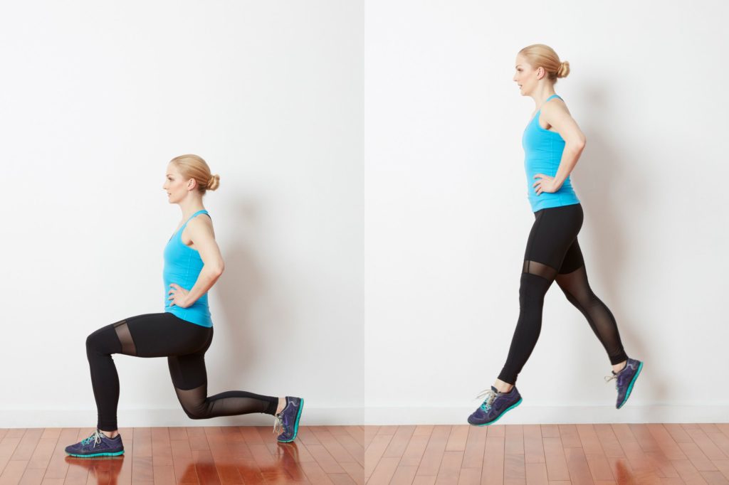 Выполнение: станьте ровно, ноги вместе. Далее сделайте выпад правой ногой и вернитесь в исходное положение с помощью прыжка. Затем поменяйте ногу. Повторите 10 раз.