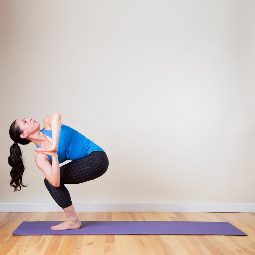 Расположите ноги вместе и сложите ладони перед грудью, разведя локти в стороны. Присядьте, согнув колени под углом 90 градусов. Поверните корпус в сторону и наклоните его вниз так, чтобы ваши плечи оказались в вертикальном положении.