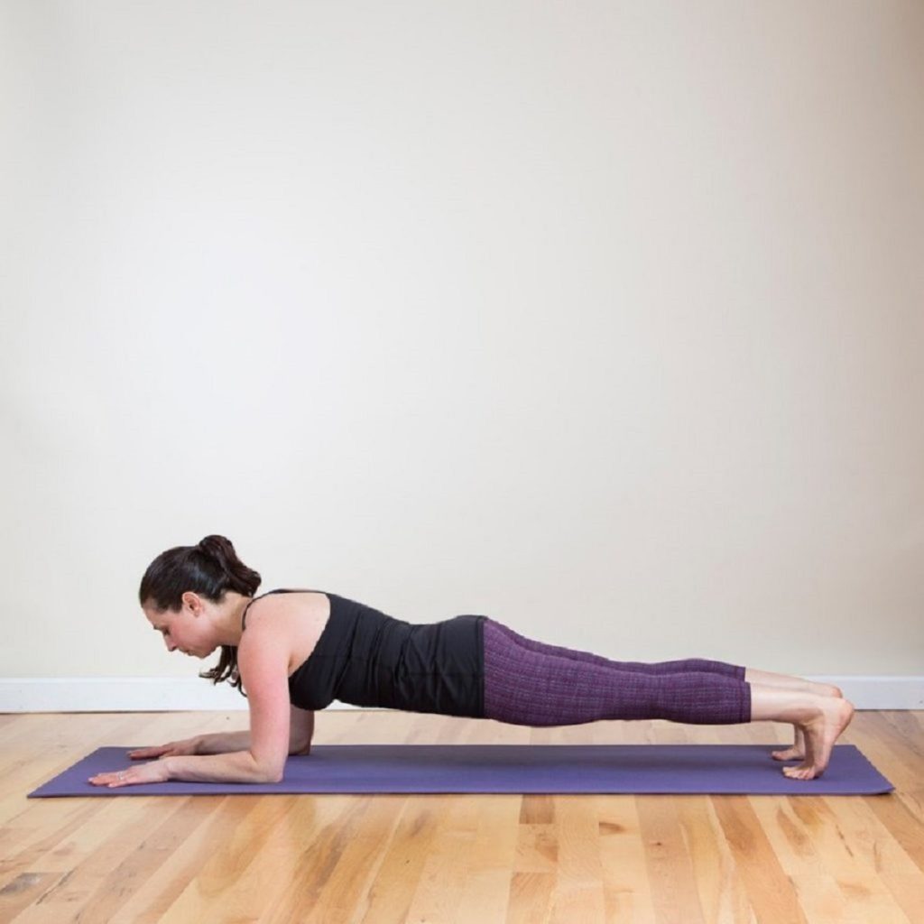 Займите положение для отжиманий. Ваши ноги должны находиться на ширине плеч. Теперь опуститесь в положение плечевой планки. Для этого перенесите вес тела на предплечья. Задержитесь в этой позиции на 5 вдохов.