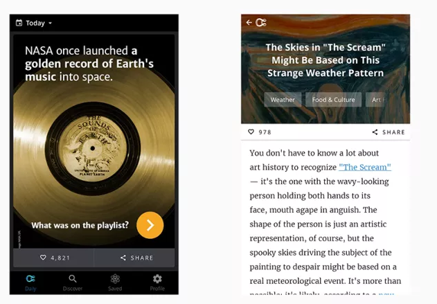 Вы можете развивать свой кругозор и умственные способности, уделяя этому приложению всего 5 минут в день. Curiosity полно интересных фактов обо всем на свете, которые поданы в краткой и легкой форме. Приложение доступно для платформ Android и iOS.